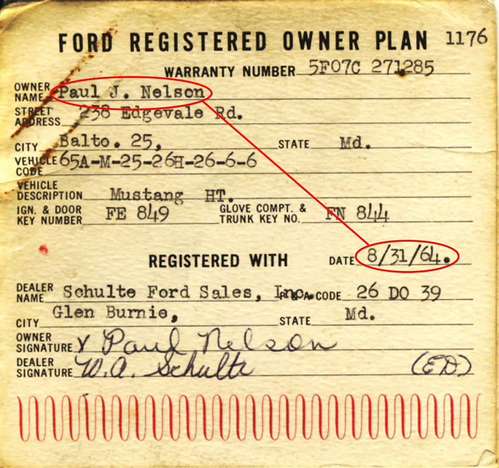 Im Mai 1964 wurde der Ford-Mustang auf der Automesse in Detroit vorgestellt. Mein Vater hat sich im Juni einen Wagen bestellt, der am 31.08.64 geliefert wurde. Der Original-Kaufbeleg ist noch immer in meinem Besitz.
